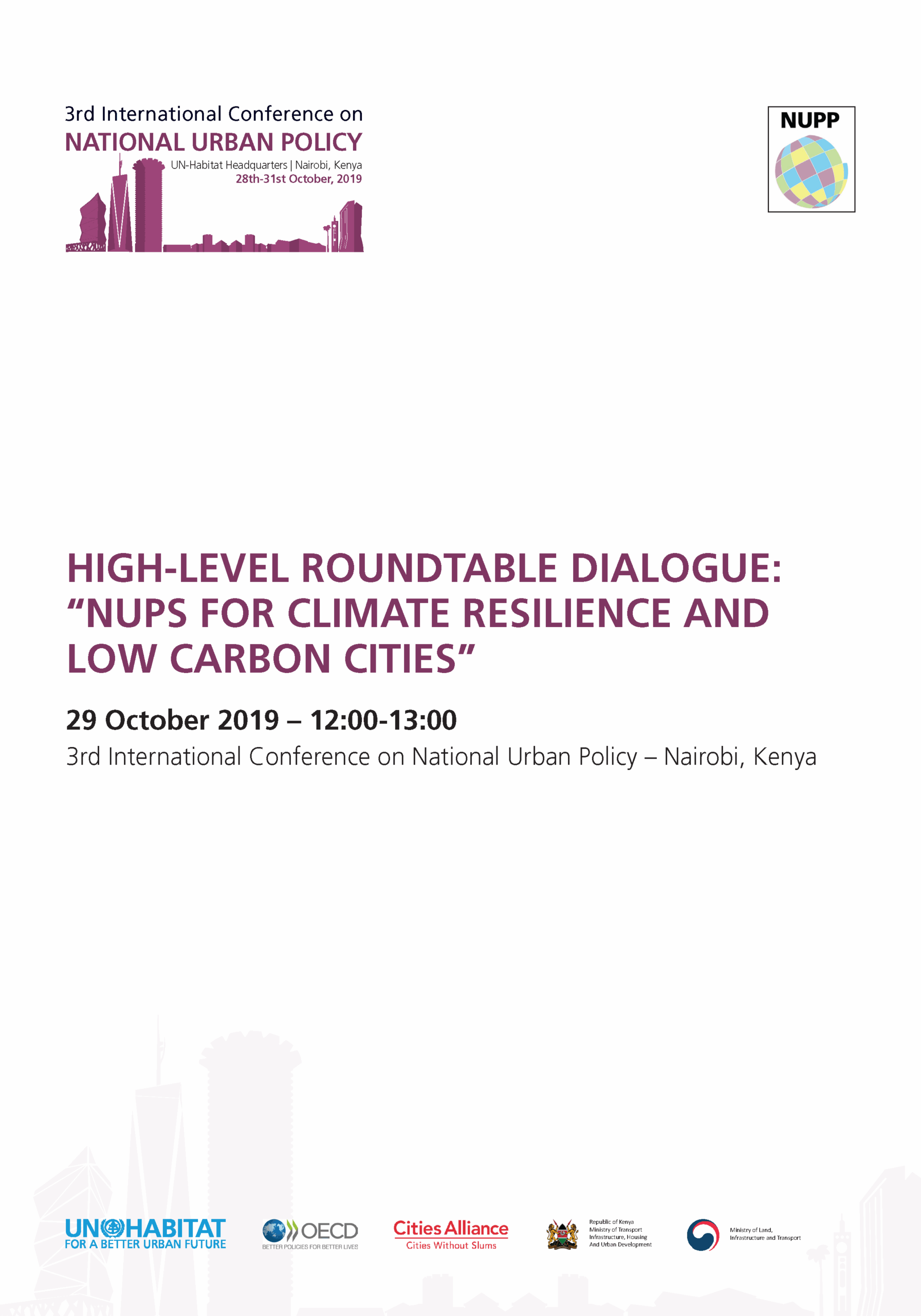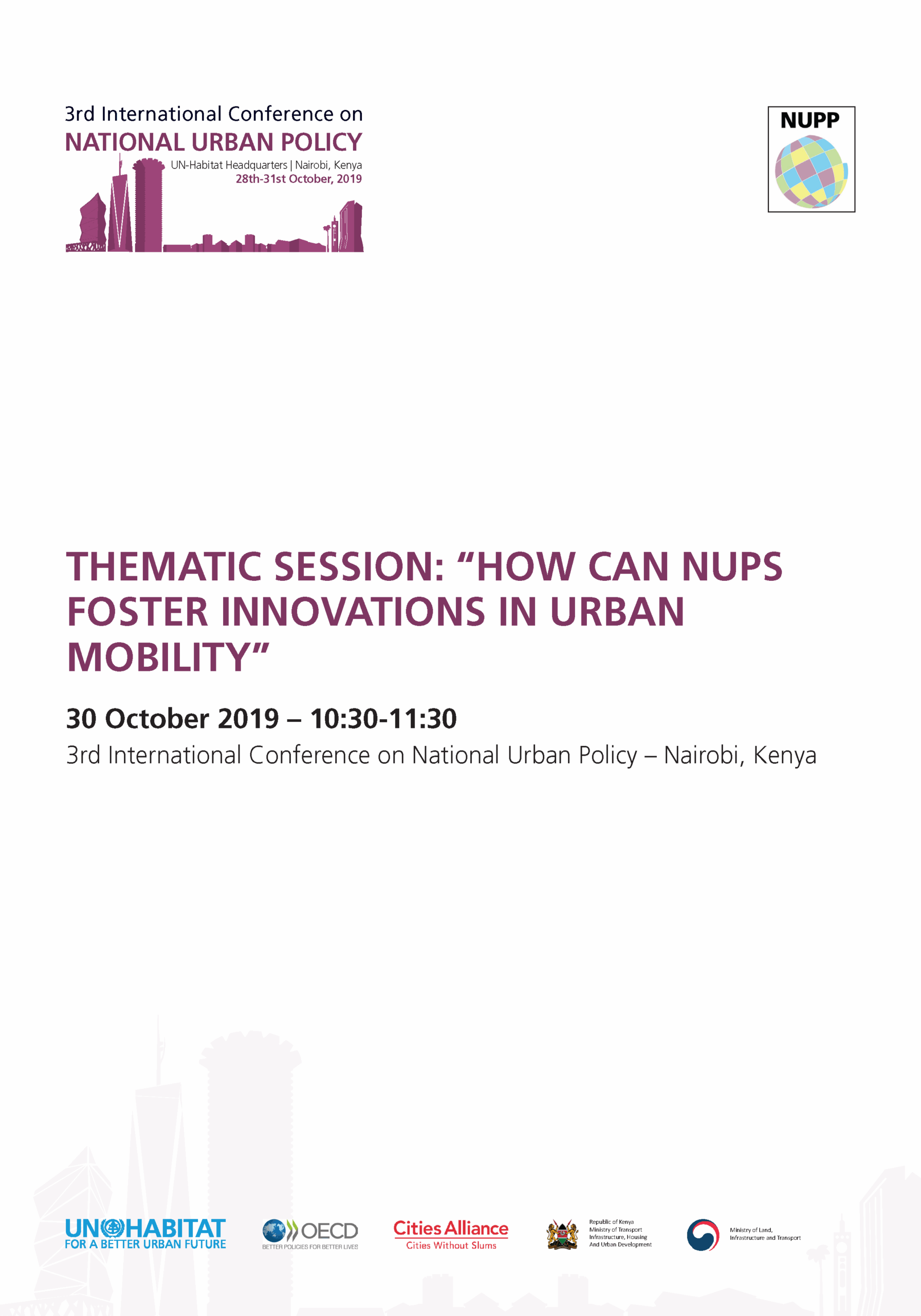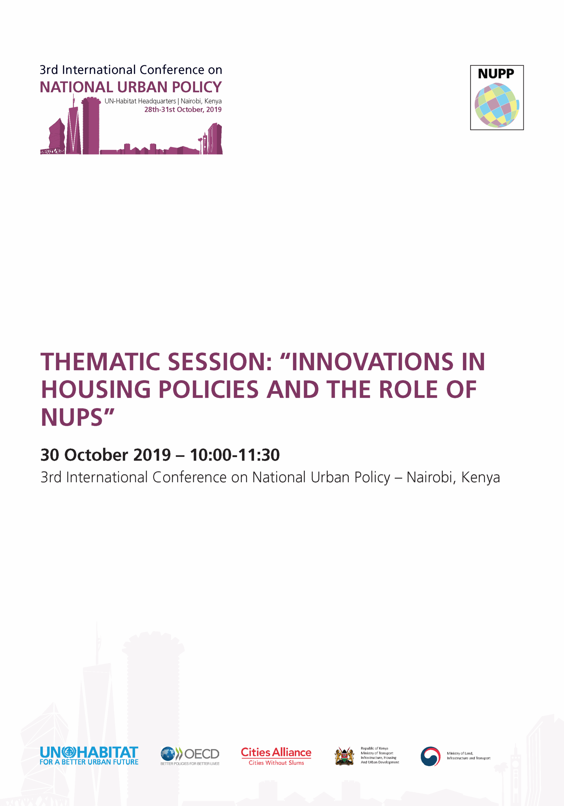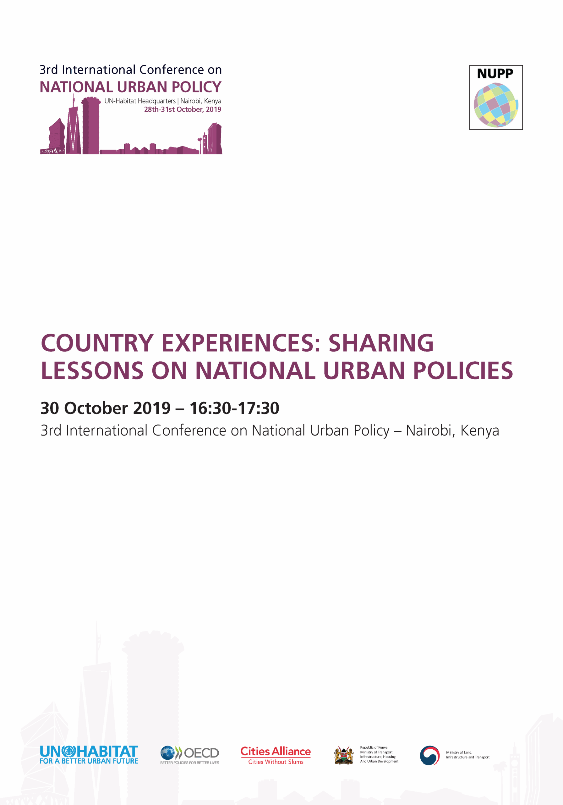 The International Conference on Urban Policy is one of the key activities of the National Urban Policy Programme (NUPP), a joint global initiative of UN-Habitat, OECD and Cities Alliance. NUPP works to bridge the capacity gap by working with the national and local governments as well as relevant stakeholders in order to allow them to build the specialized skills required to develop NUP.